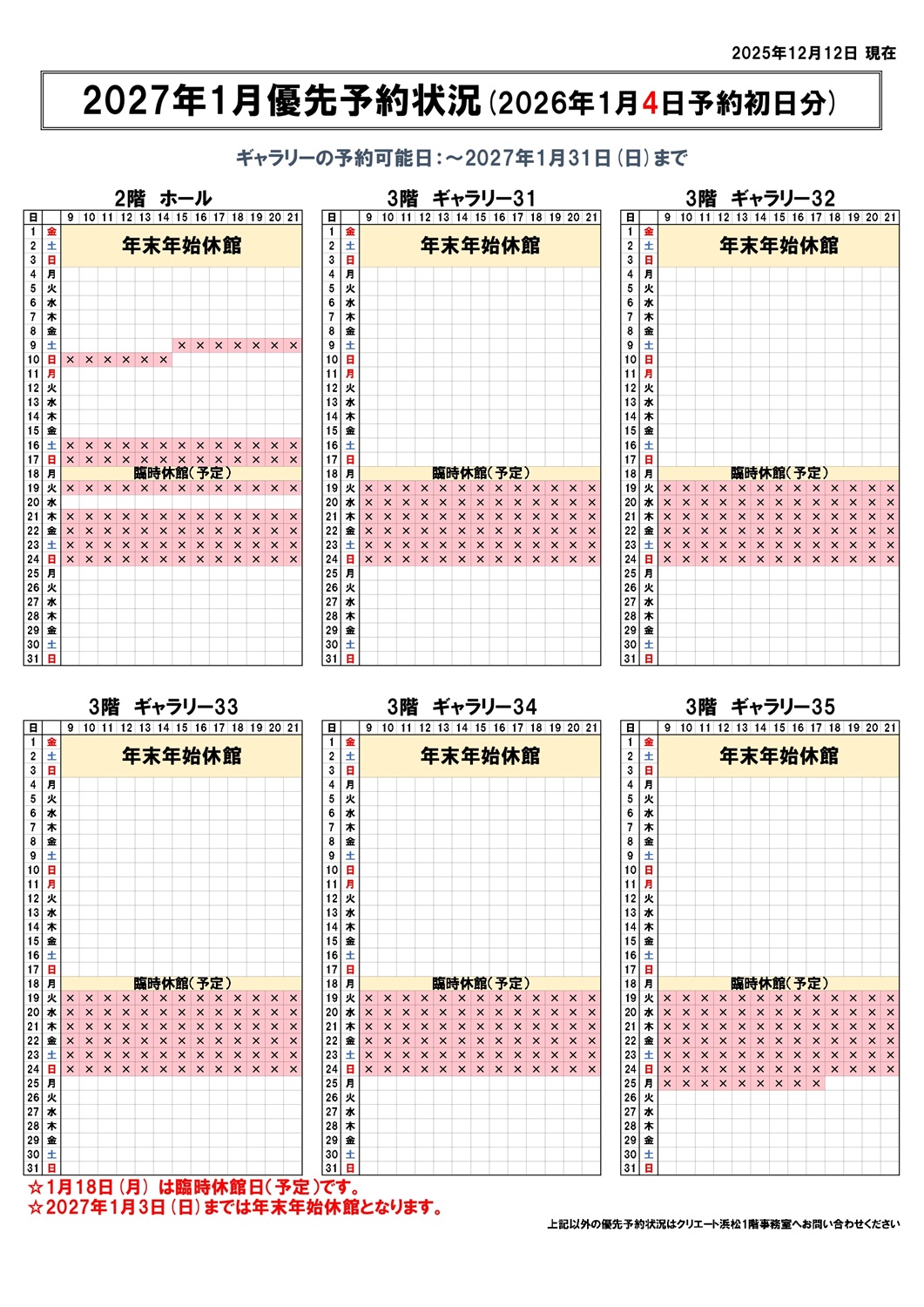 2027年1月ホール・ギャラリー優先予約状況(クリックして表示)