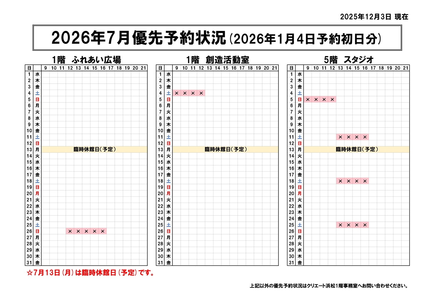 2026年1月4日施設初日予約のご案内・優先予約状況(12/24現在)