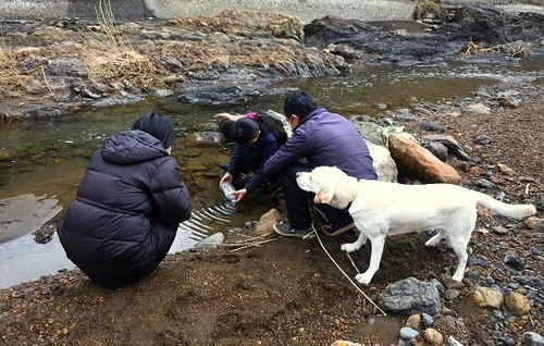 ワンちゃんも心配して見守ってくれています。この稚魚達が大きく育ち、海に出て厳しい自然の中を生き抜いて果たして「サツキマス」となって故郷の川に帰ってこれるのか?アマゴ稚魚達の成長において重要な自然環境保護について、放流会に参加して下さった皆さんも肌で感じて頂けたでしょうか?