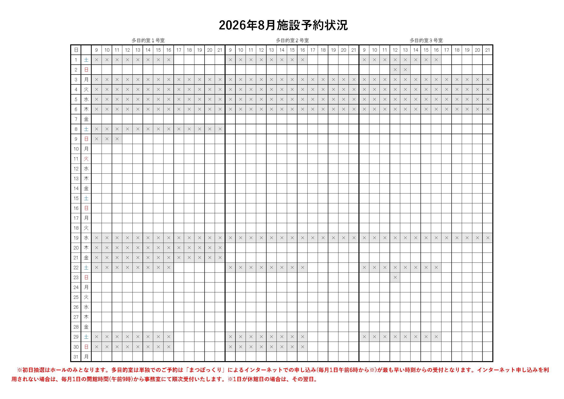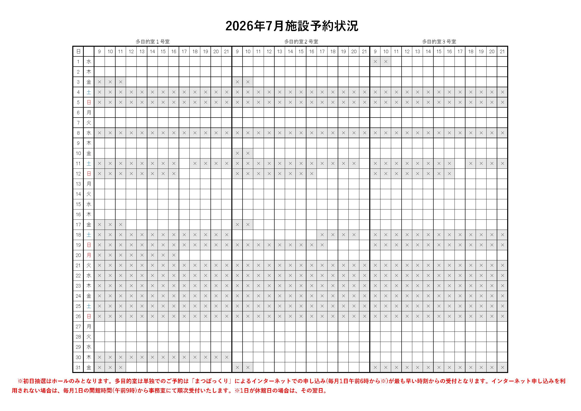 また、2027年1,2月のホール、2026年7,8月の多目的室の予約状況をおしらせいたします。