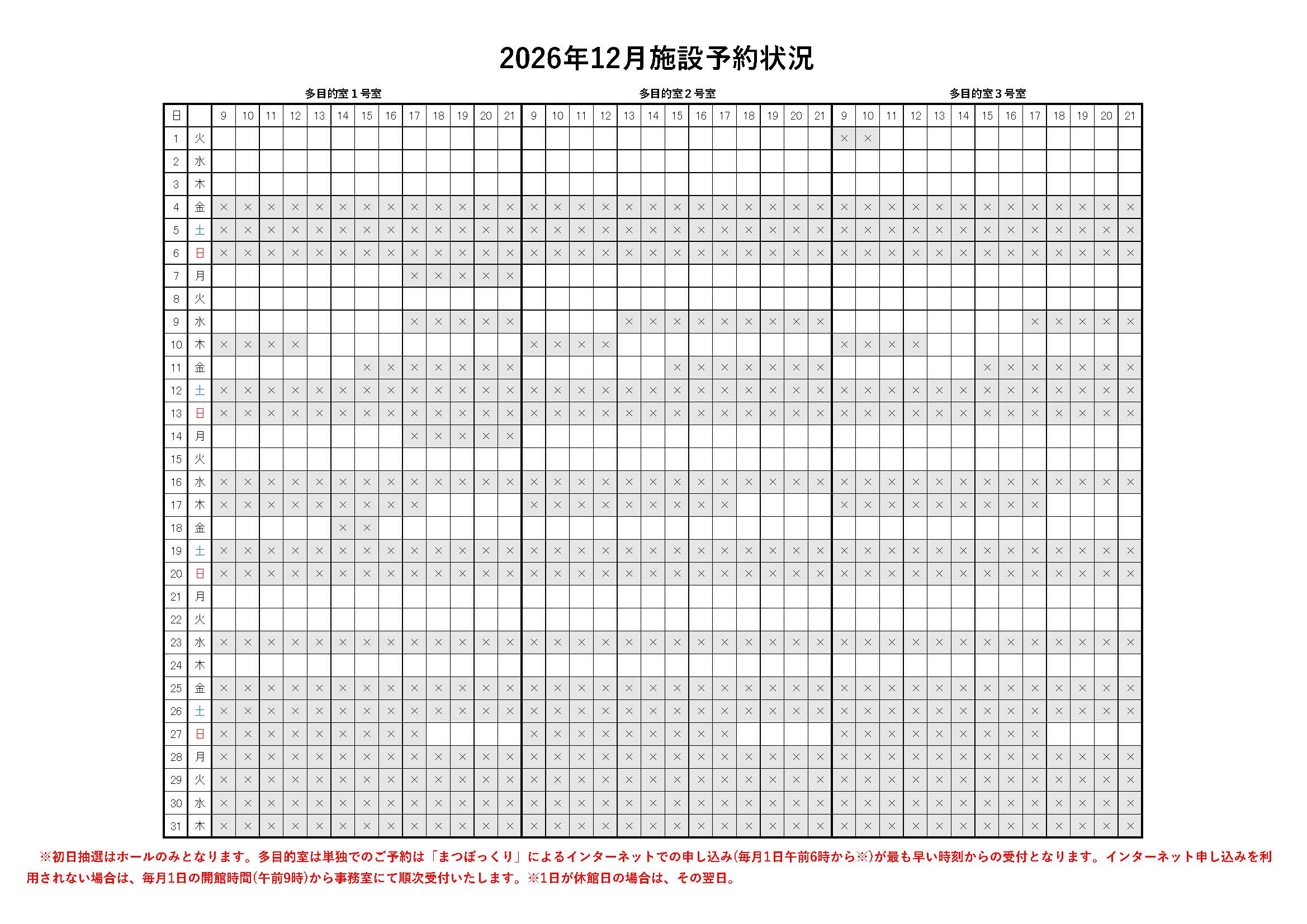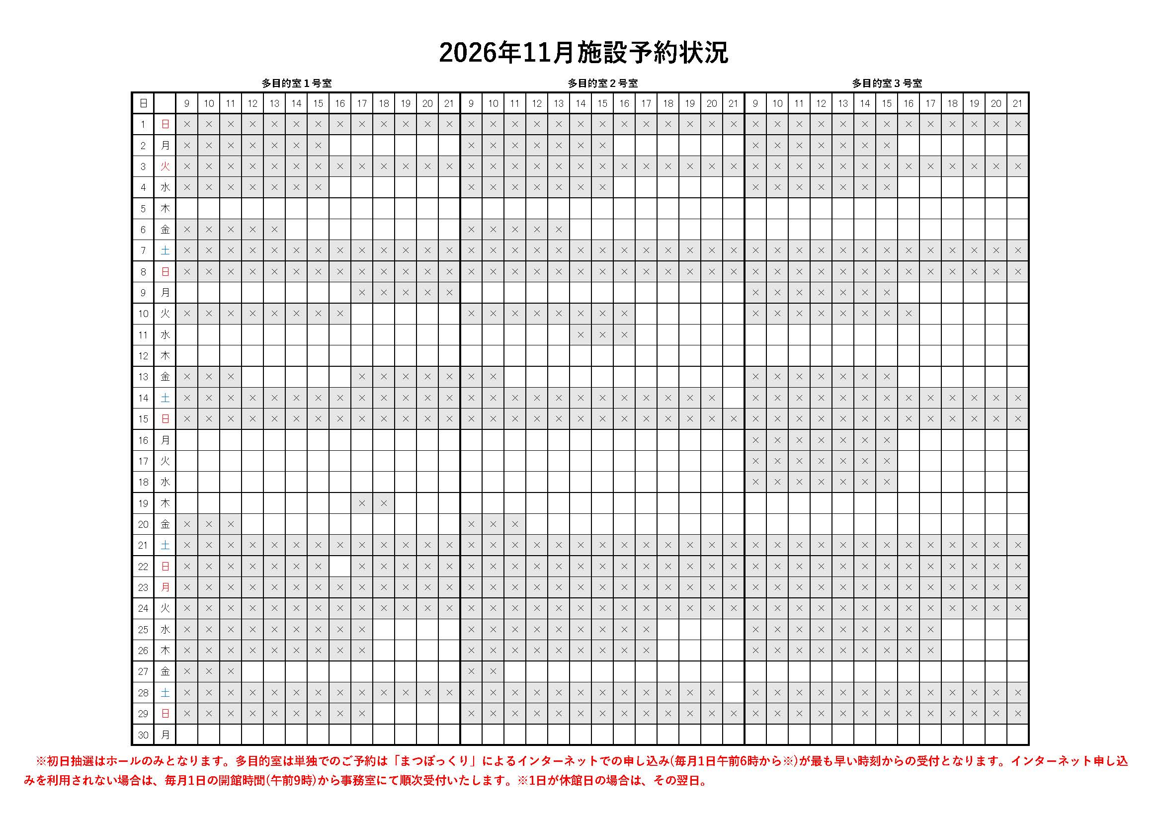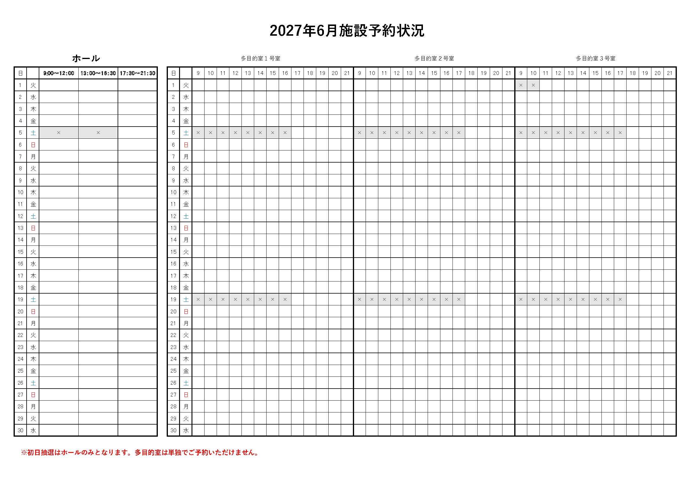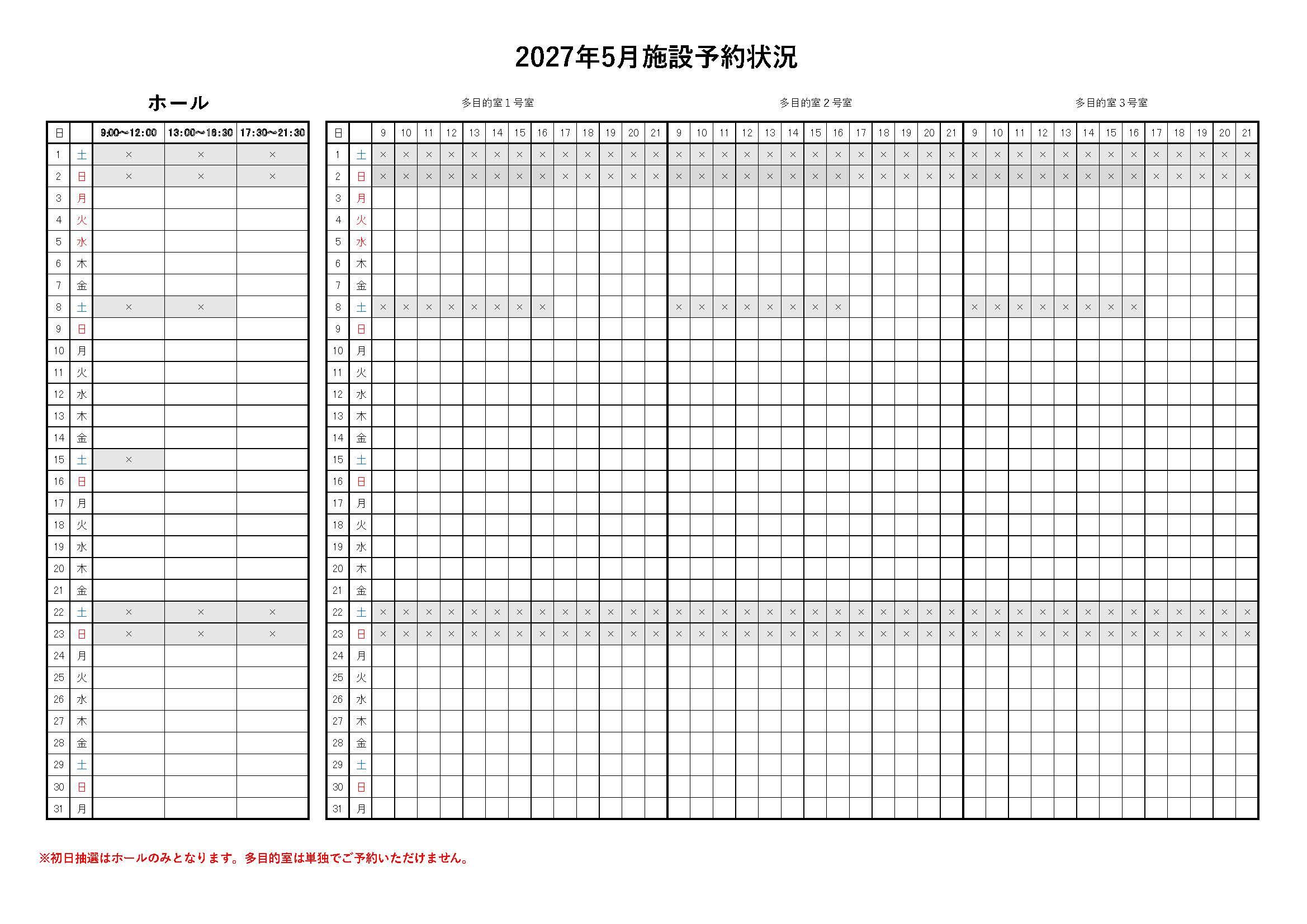 また、2027年5,6月のホール、2026年11,12月の多目的室の予約状況をおしらせいたします。