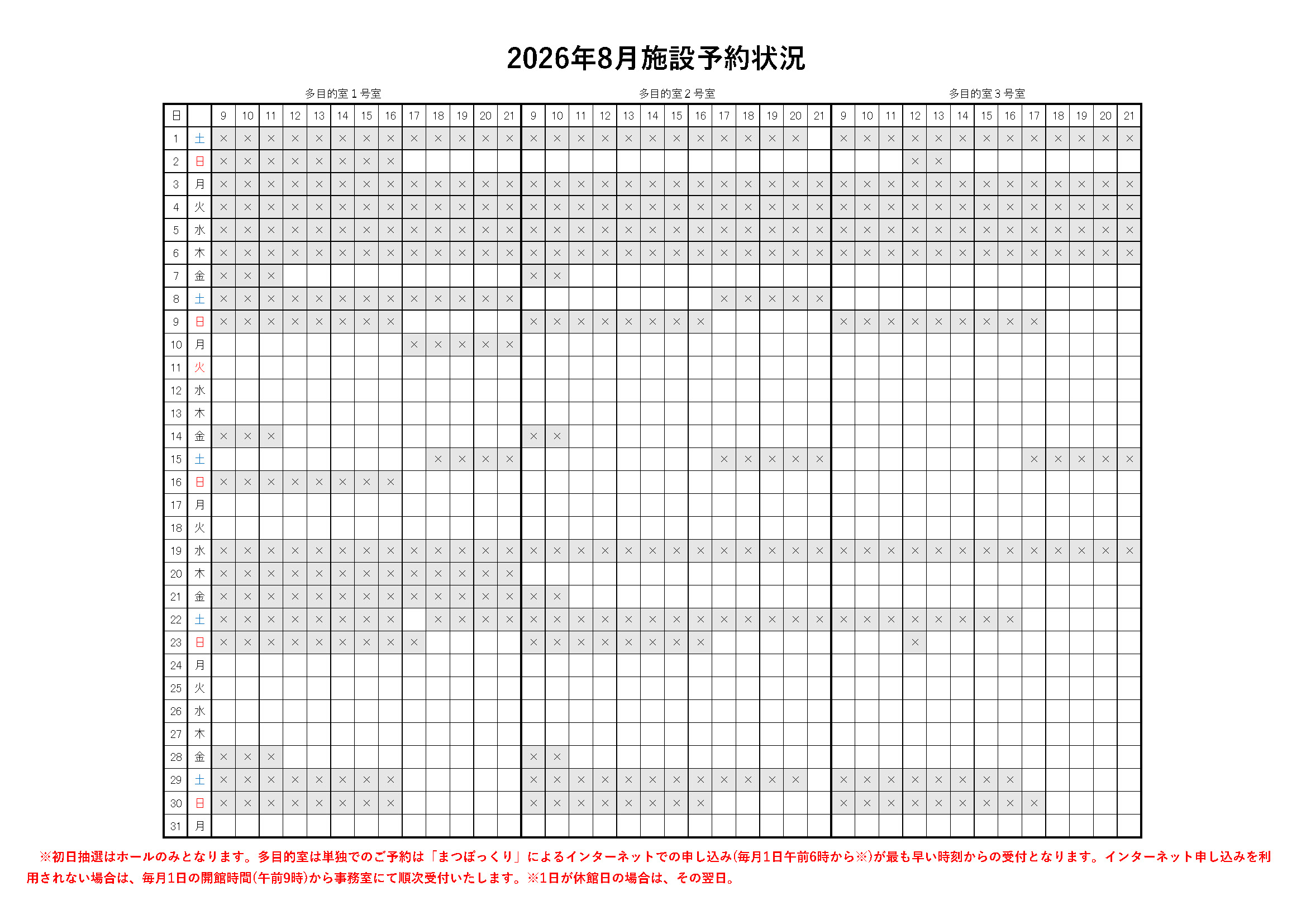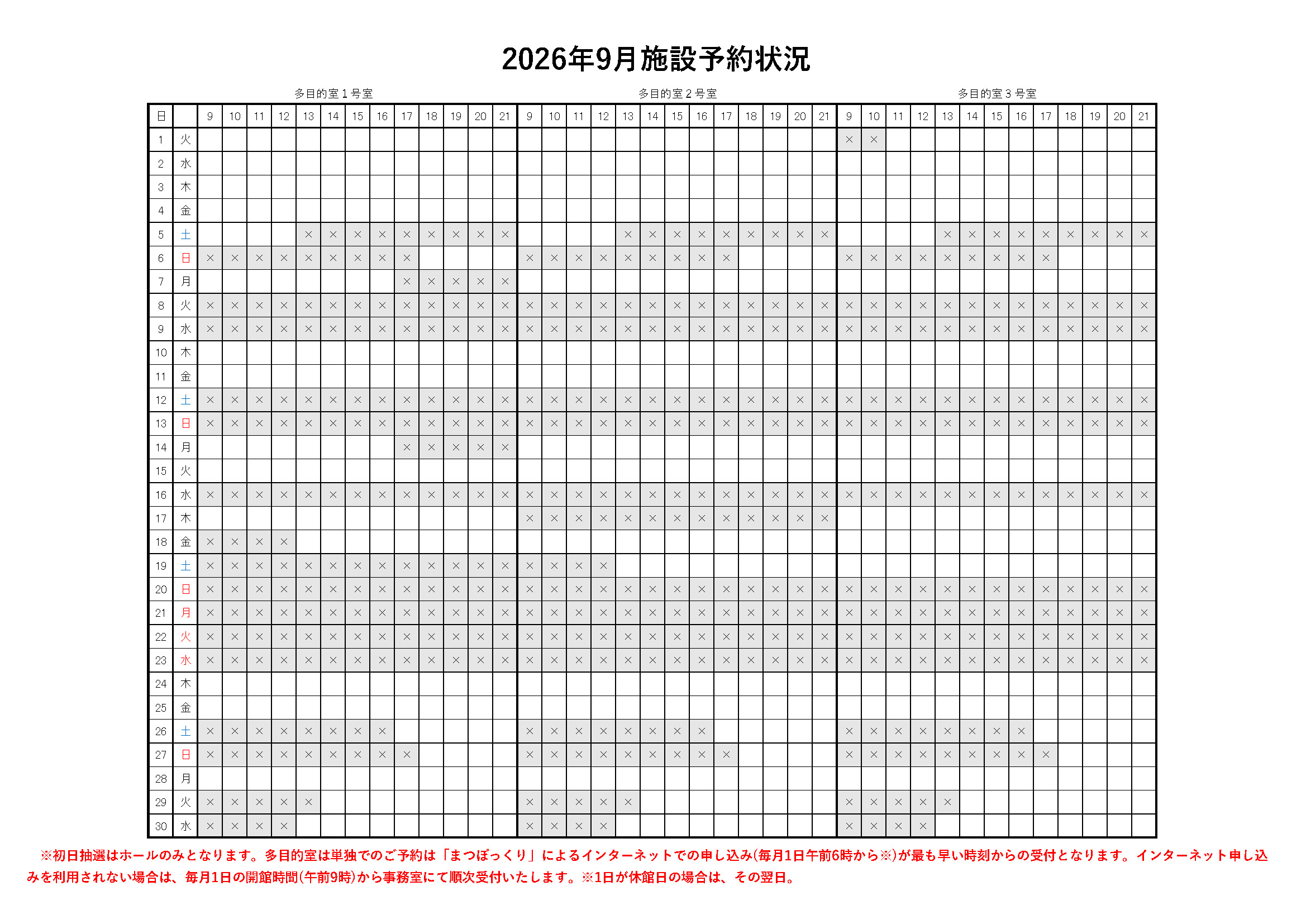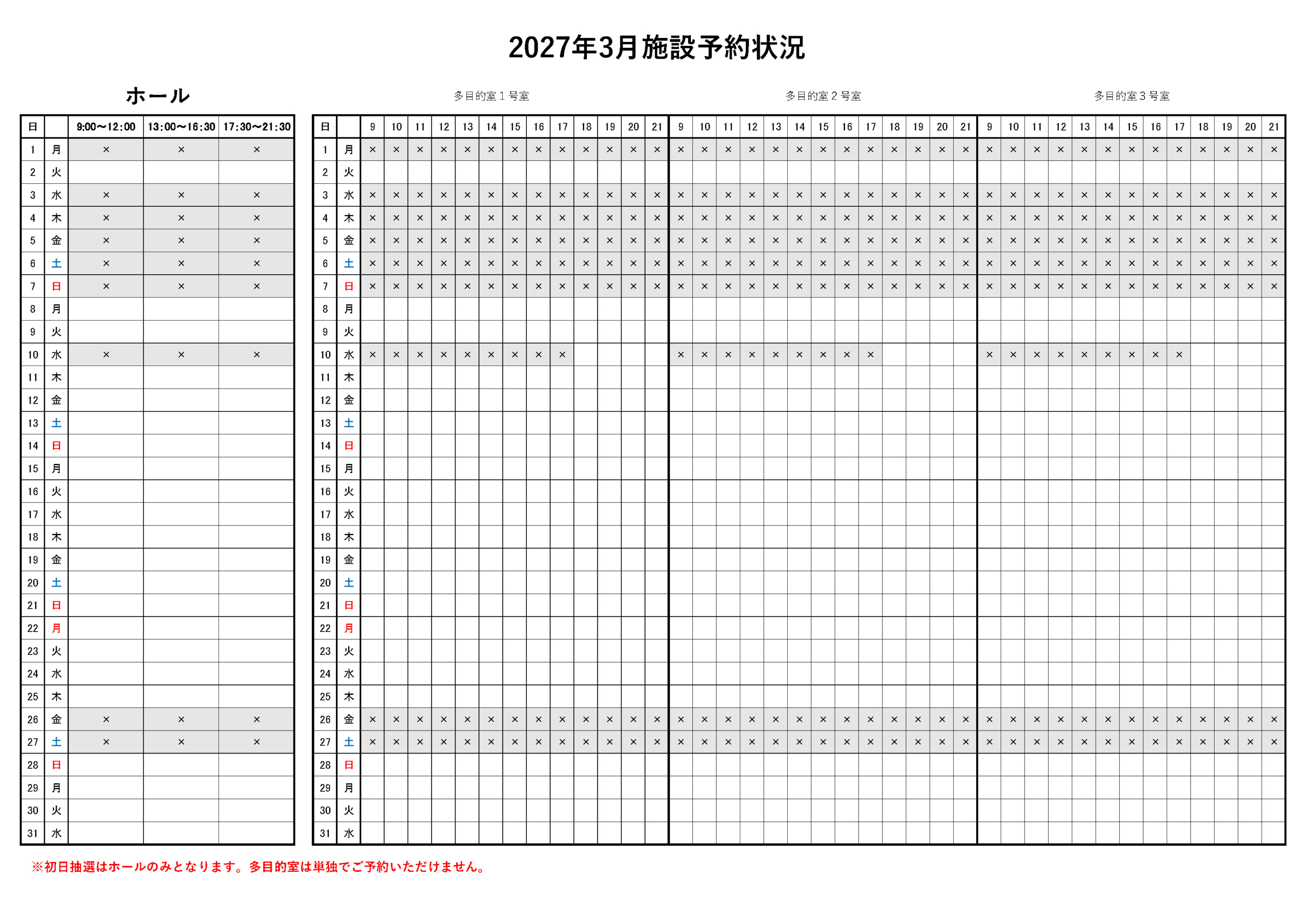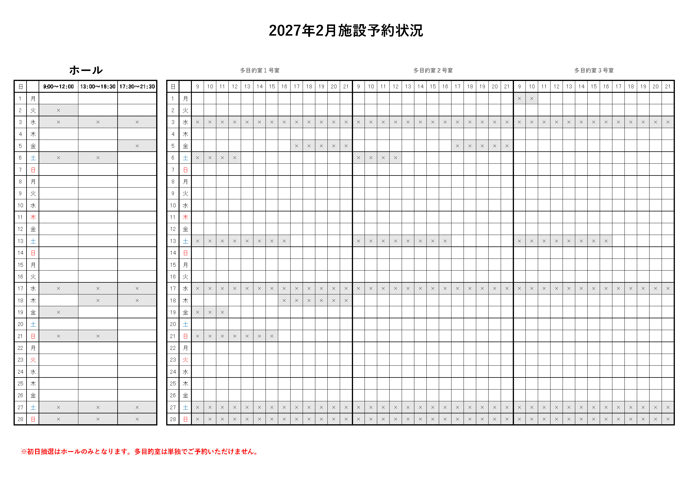 また、2027年2,3月のホール、2026年8,9月の多目的室の予約状況をおしらせいたします。