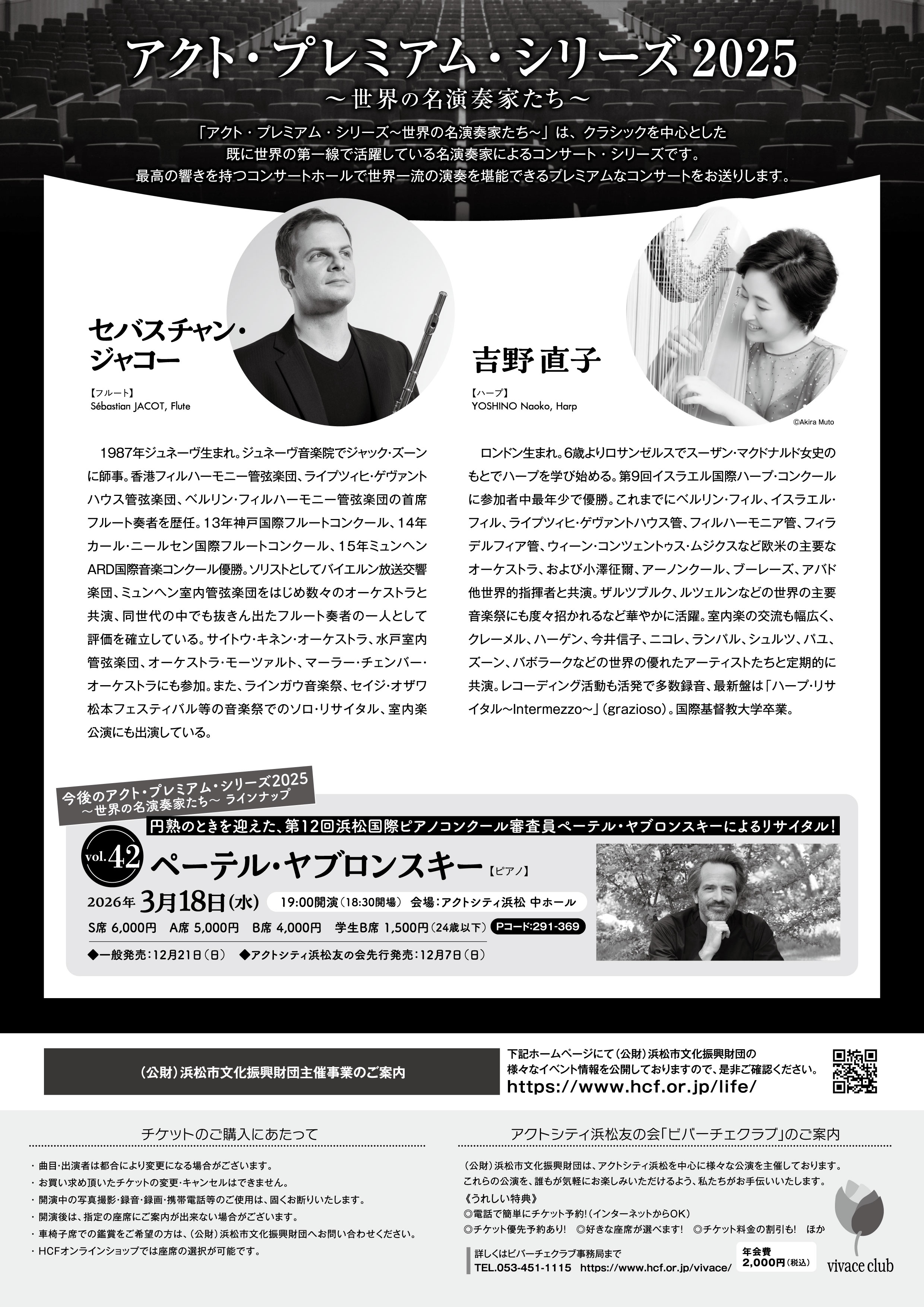 世界の第一線で活躍している名演奏家たちを浜松にお招きするプレミアムなコンサート・シリーズです。