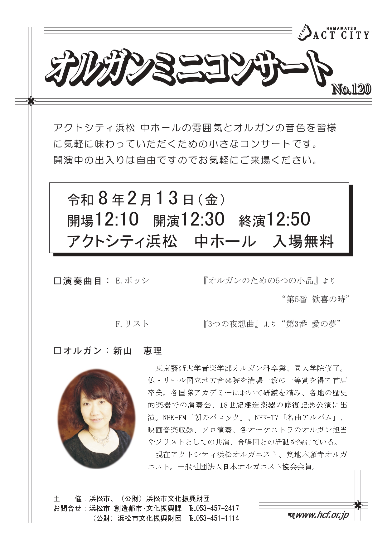 | 2026年2月13日(金)12:30~12:50 | 第120回オルガンミニコンサート | 新山 恵理 | 無料 |